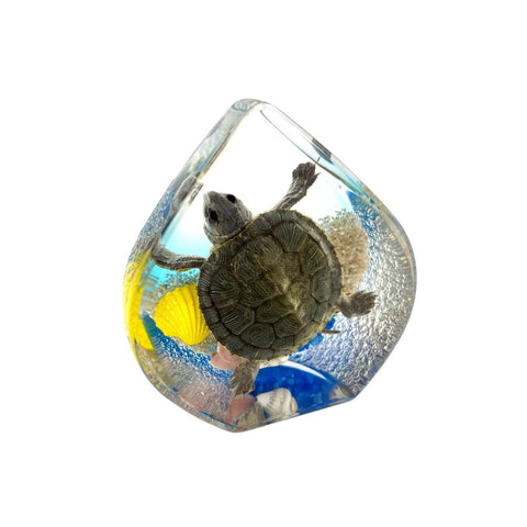 Bring the beauty of the ocean to your home or office with this real turtle preserved in a teardrop-shaped resin display. Perfect as a desktop decoration, paperweight, or unique gift, this piece captures the wonder of marine life forever.